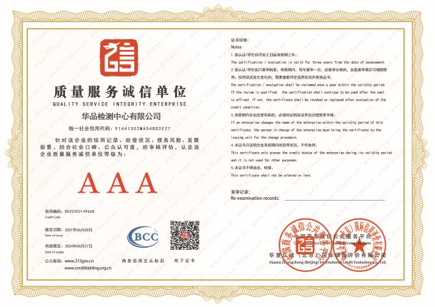 华品检测通过了检验检测机构资质认定(CMA)、ISO 9001质量管理体系、ISO 14001环境管理体系及OHSAS18001职业健康安全管理体系等认证。