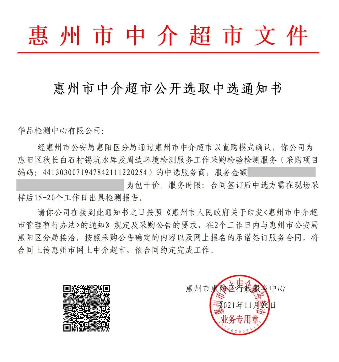 华品检测中心有限公司中选惠州市公安局惠阳区分局 惠阳区秋长白石村锡坑水库及周边环境检测服务工作